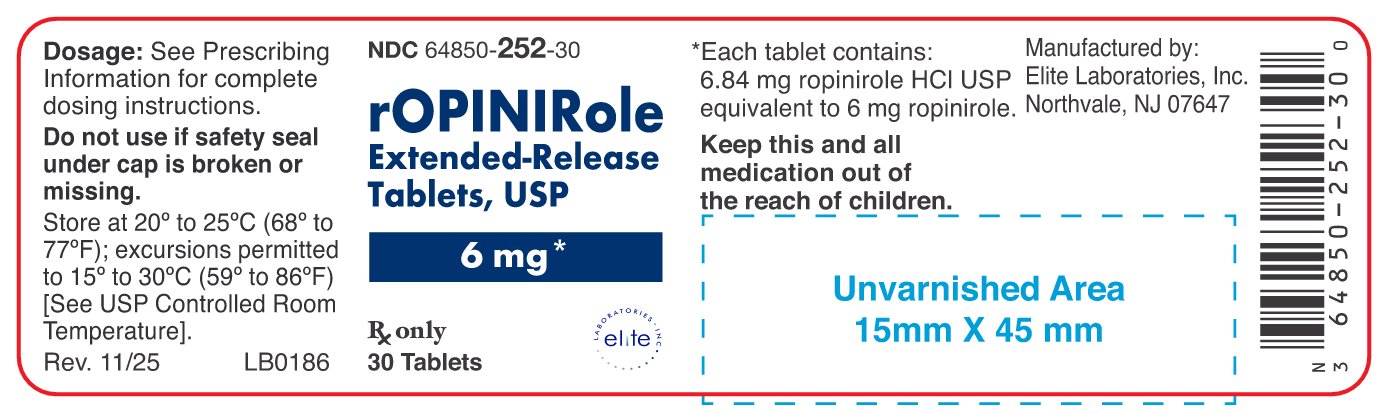 This text provides information on a medication containing 6.84 mg of ropinirole hydrochloride USP in each tablet. The dosage and manufacturer (Elite Laboratories, Inc.) are mentioned, along with dosing instructions and storage recommendations. The medication is in tablet form with a specific National Drug Code (NDC) of 64850-252-30. It is essential not to use the medication if the safety seal is broken or if tablets are missing. Storage at 20° to 25°C (68° to 77°F), with excursions permitted to 15° to 30°C (59° to 86°F), is recommended. It also indicates the tablet is Extended-Release and provides contact information for the manufacturer in Northvale, NJ, 07647.*