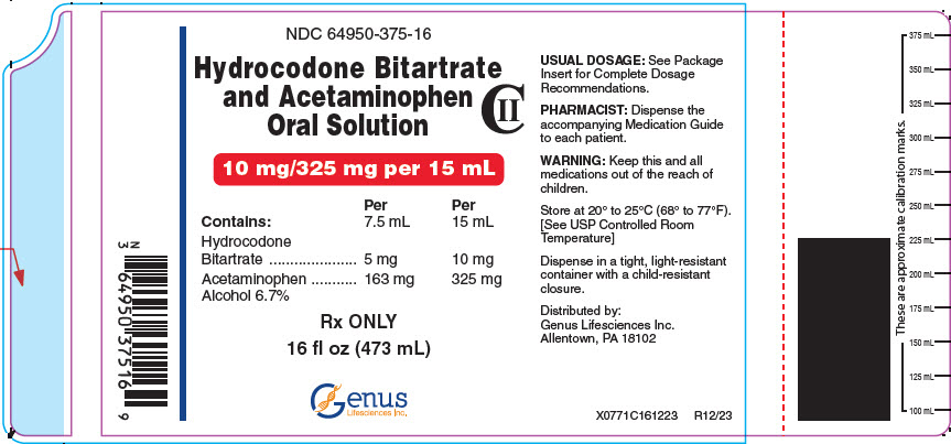 The following 3 images provide visual information about the product associated with Hydrocodone Bitartrate And Acetaminophen NDC 64950-375 by Genus Lifesciences Inc., such as packaging, labeling, and the appearance of the drug itself. This resource could be helpful for medical professionals, pharmacists, and patients seeking to verify medication information and ensure they have the correct product.