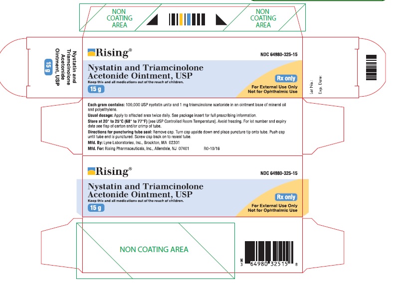 Rising® NDG 64980-325-15 is a medication containing Nystatin and Triamcinolone Acetonide Ointment to be used externally. Each gram of the ointment contains 100,000 USP nystatin units and 1 mg triameinokine acetonide, mixed with mineral oil and pobethylene. It is suggested to keep this medication away from children and not to be used for ophthalmic purposes. The package insert should be referred to for full prescribing information. It is advised to store between 20°C to 25°C (68°F to 77°F) and avoid freezing. The pointed end on the cap may be used to puncture the seal. The company that manufactured the medication is Lyne Laboratrie and it is distributed by Rising Pharmaceuticals in Alndale, NJ. The expiry date and bad number can be found on the tube.*