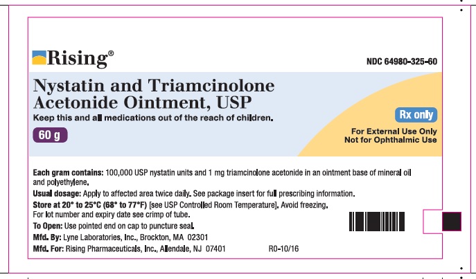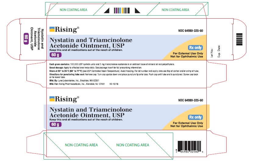 Rising® NOC 64380-325-60 is a medicinal ointment that contains Nystatin and Triamcinolone Acetonide. It is for external use only and should be kept out of reach from children. Each gram contains 100,000 USP nystatin units and 1 mg triamcinolone acetonide in an ointment base of mineral oil and polyethylene. Usual dosage is to apply the ointment to the affected area twice daily. It should be stored at 20°C to 25°C and must be protected from freezing. The tube crimp contains information about the lot number and expiry date. Produced by Lyne Laboratories, Inc., Brockton, MA.*