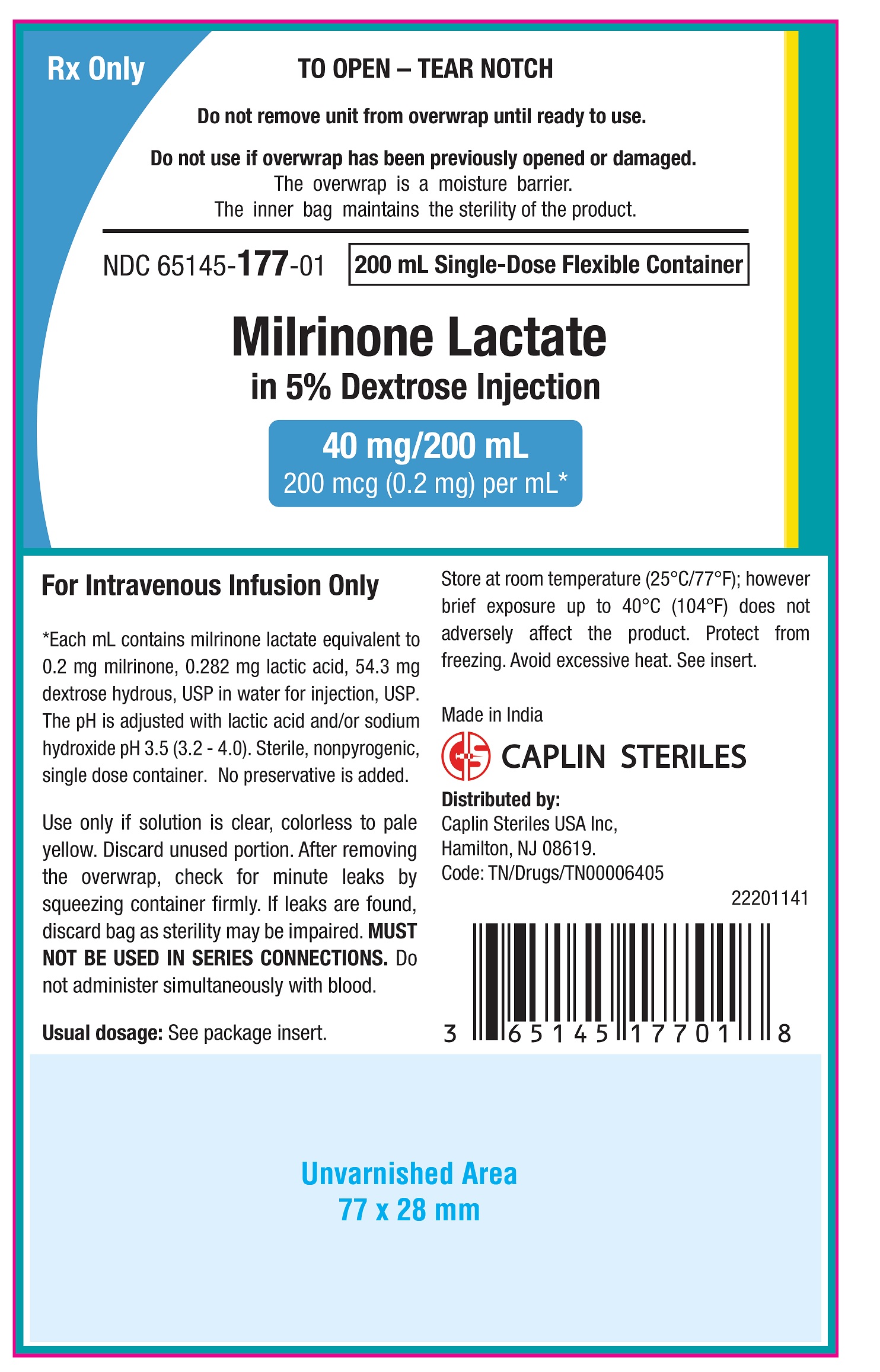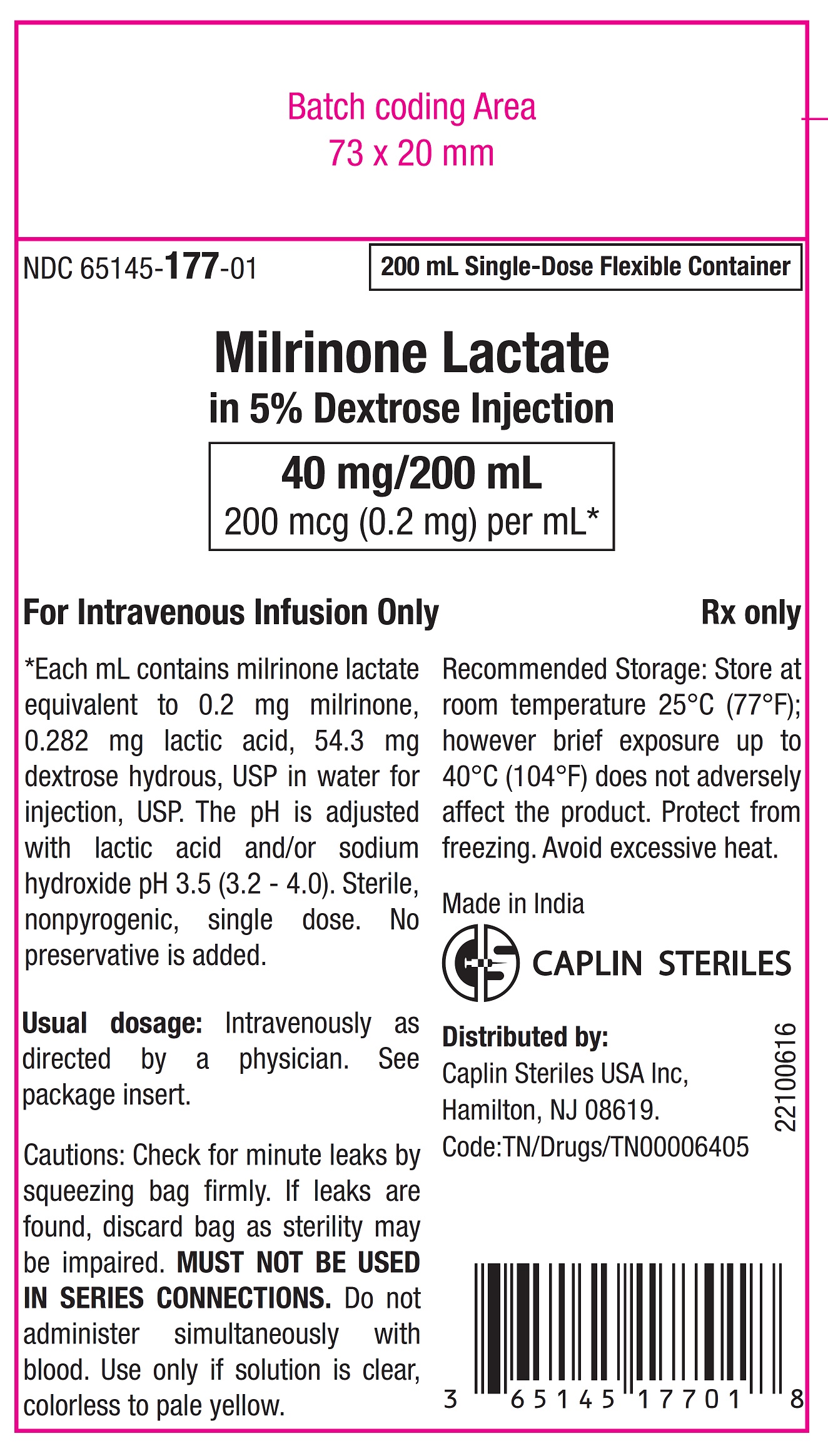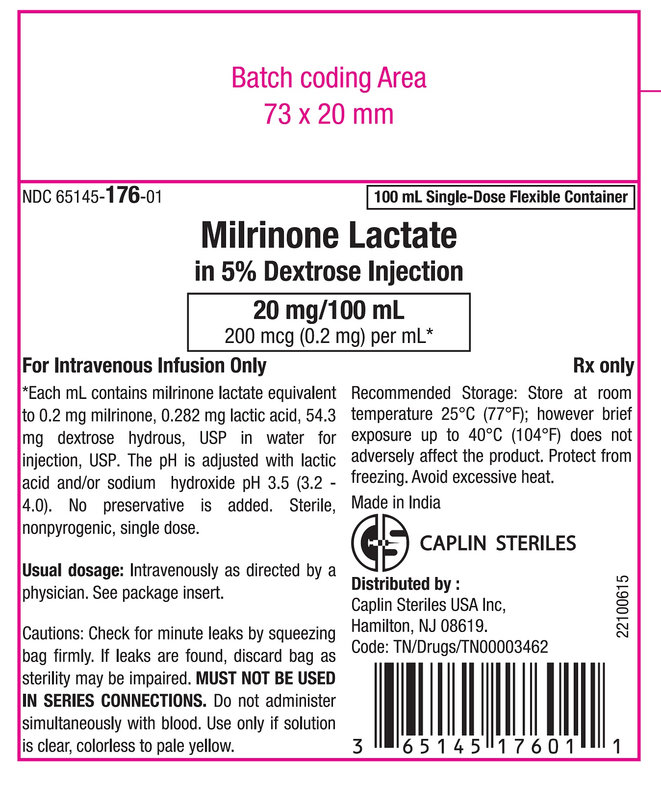 The following 6 images provide visual information about the product associated with Milrinone Lactate In 5% Dextrose NDC 65145-176 by Caplin Steriles Limited, such as packaging, labeling, and the appearance of the drug itself. This resource could be helpful for medical professionals, pharmacists, and patients seeking to verify medication information and ensure they have the correct product.