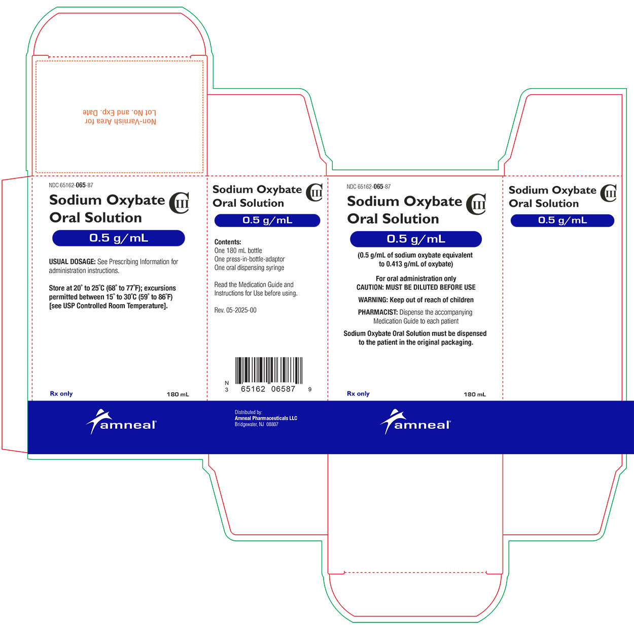 This is information about a Sodium Oxybate oral solution with a concentration of 0.5 g/mL. The usual dosage instructions can be found in the prescribing information. It should be stored at a temperature range of 20° to 25°C (68" to 77°F) with excursions permitted between 15° to 30°C (59" to 86°F). The solution is distributed by Amneal Pharmaceuticals LLC. The medication is in a 180 mL container and pharmacist is advised to dispense the Medication Guide to each patient.*
