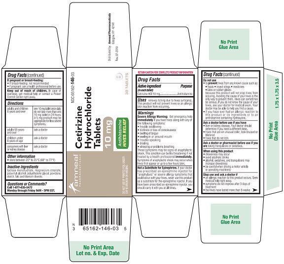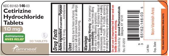 The following 4 images provide visual information about the product associated with Cetirizine Hydrochloride Hives Relief NDC 65162-146 by Amneal Pharmaceuticals, such as packaging, labeling, and the appearance of the drug itself. This resource could be helpful for medical professionals, pharmacists, and patients seeking to verify medication information and ensure they have the correct product.