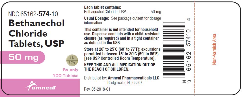 The following 5 images provide visual information about the product associated with Bethanechol Chloride NDC 65162-574 by Amneal Pharmaceuticals Llc, such as packaging, labeling, and the appearance of the drug itself. This resource could be helpful for medical professionals, pharmacists, and patients seeking to verify medication information and ensure they have the correct product.