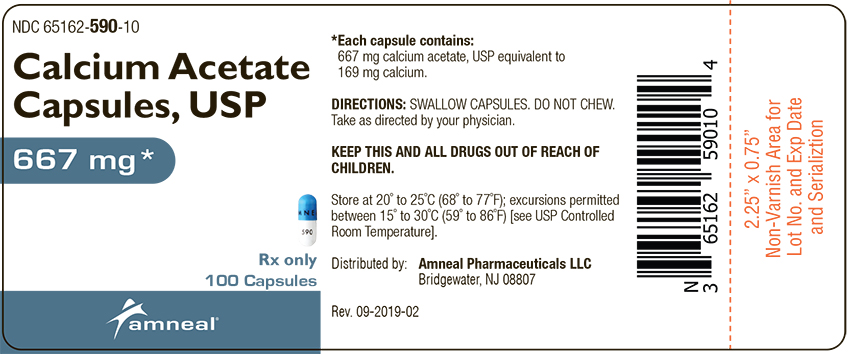 Each capsule has a light-blue cap imprinted with “AMNEAL” and white body imprinted with “590” with black ink. Each capsule contains 667 mg calcium acetate, USP (anhydrous; Ca(CH3COO)2; MW=158.17 grams) equal to 169 mg (8.45 mEq) calcium. Each capsule also contains the following inactive ingredients: FD&C Blue #1, FD&C Red #3, gelatin, magnesium stearate, polyethylene glycol and titanium dioxide. In addition to the inactive ingredients listed above, each capsule contains Opacode (Black) monogramming ink. Opacode (Black) contains D&C Yellow #10, FD&C Blue #2, FD&C Red #40, iron oxide black and shellac. Opacode (Black) may also contain ethanol, methanol, n-butyl alcohol and propylene glycol.