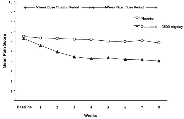 This appears to be a figure or table showing the mean pain scores over a period of 8 weeks. The study seems to have a titration period of 4 weeks followed by a fixed dose period of 4 weeks. The two treatments being compared are a placebo and Gabapentin with a maximum dose of 3600mg per day. However, without more context or information it is difficult to make any further conclusions.*