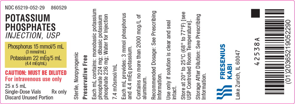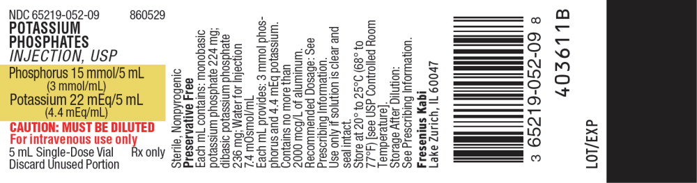 This is a description of a medication called POTASSIUM PHOSPHATES INJECTION, USP. It contains 15 mmol/5 mL of phosphorus and 22 mE of potassium, and must be diluted before intravenous use. It comes in a 5 mL Single-Dose Vial which should have any unused portion discarded.*