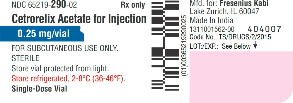 This is product information for a subcutaneous injection indicated for medical use. It is a sterile solution contained in a single-dose vial. The vial should be protected from light and stored refrigerated between 2-8°C. The product contains Cetrorelix Acetate for Injection at a strength of 0.25 mg per vial. The manufacturer is Fresenius Kabi based in Lake Zurich, IL.*