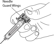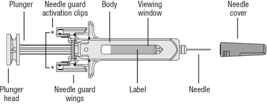 This is a part of a medical device associated with a plunger and a needle guard for safe administration. It also includes activation clips and head wings for efficient operation. The text seems to be related to a medical injection device.*