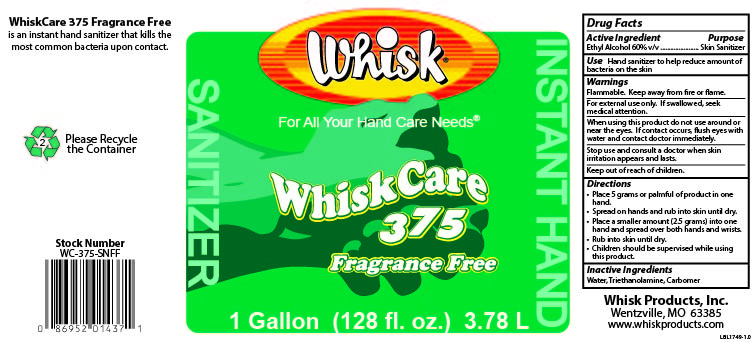 WhiskCare 375 Fragrance Free is an instant hand sanitizer that kills the most common bacteria upon contact. Stock number W3S S. The product comes in a 1 gallon (128 fl. Oz.) or 3.78L bottle, making it suitable for various hand care needs. The manufacturer is Whisk Products, Inc. located in Wentzville, MO 63385.*