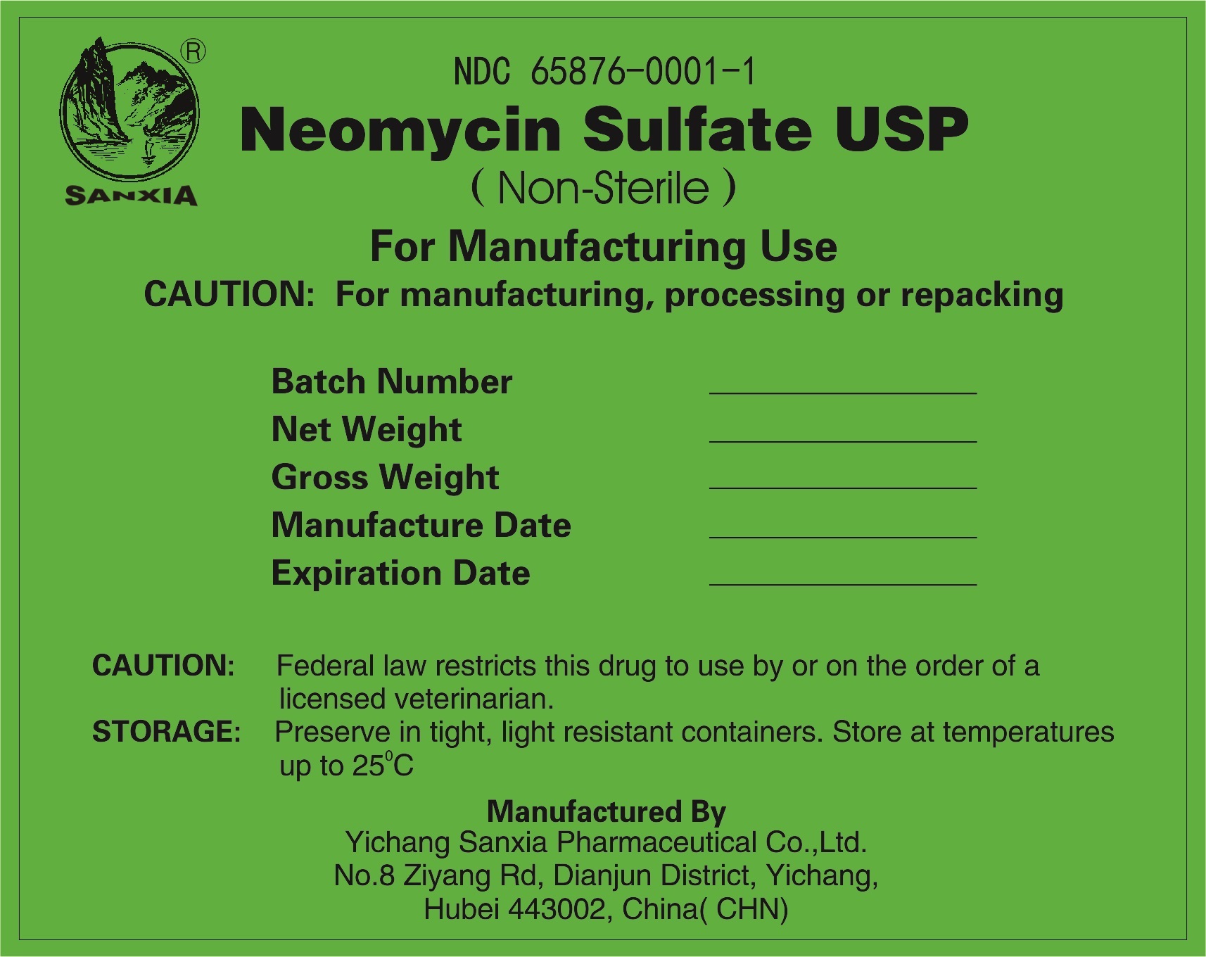 This is a label for Neomycin Sulfate USP intended for manufacturing use. The text includes important information such as the batch number, net weight, gross weight, manufacture date, expiration date, storage instructions, caution for use by licensed veterinarians, and details about the manufacturer Yichang Sanxia Pharmaceutical Co., Ltd. It is advised to store the product in tight, light-resistant containers at temperatures up to 25°C.*