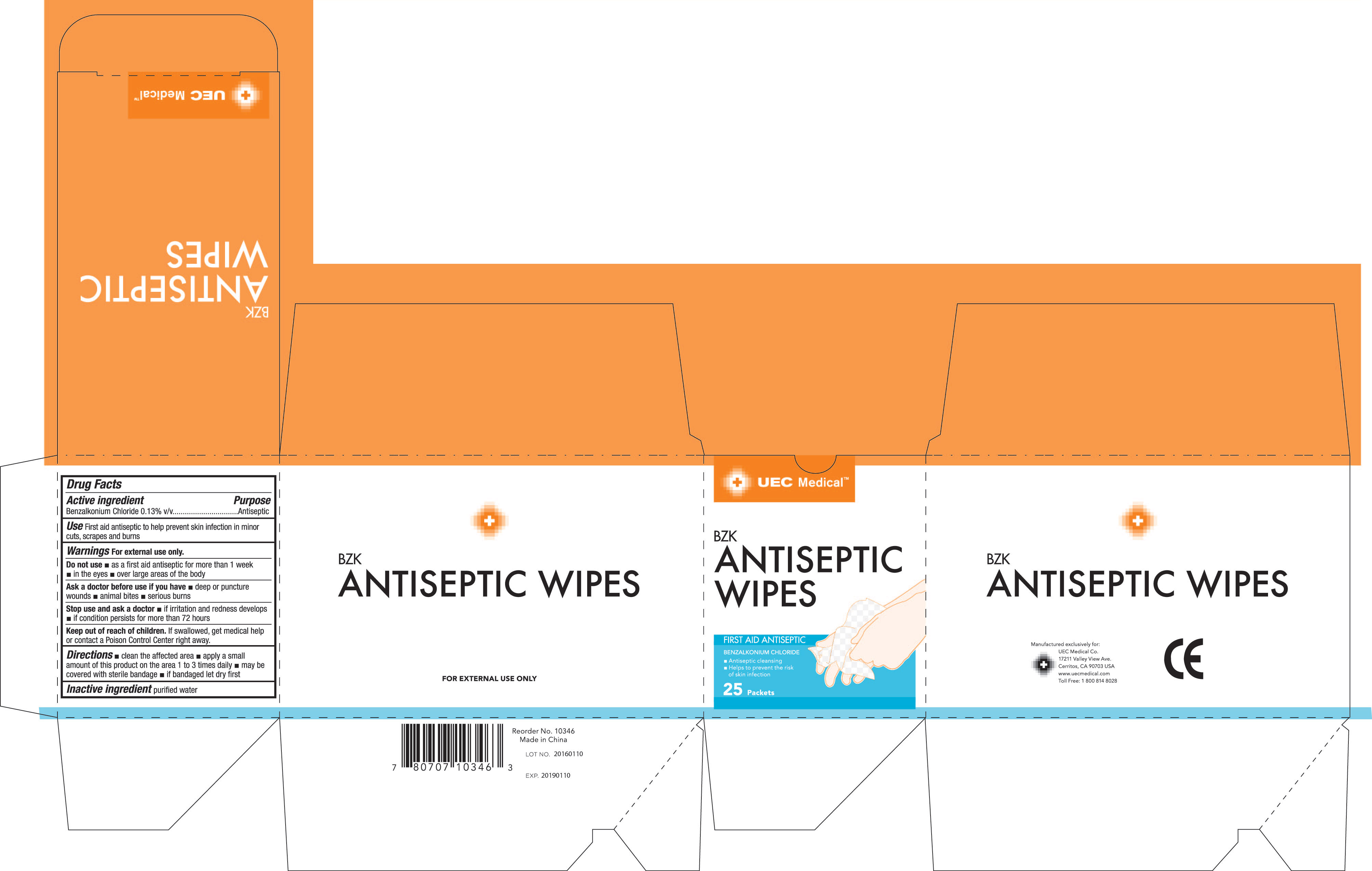 This is a drug facts sheet for an antiseptic wipe manufactured for external use by UEC Medical Co. It contains 0.13% v/v benzalkonium chloride, an antiseptic that prevents skin infections in minor cuts, burns, and scrapes. The product warnings include advice to refrain from its use in the eyes, large areas of the body, deep, puncture wounds, animal bites, or significant burns. If irritation, redness, or the condition remains unchanged after 72 hours, it is advisable to contact a doctor or medical expert. The wipe is available in 25 packets with directions to apply it to the affected area once to thrice a day and can be covered with sterile bandages. The inactive ingredient is purified water.*