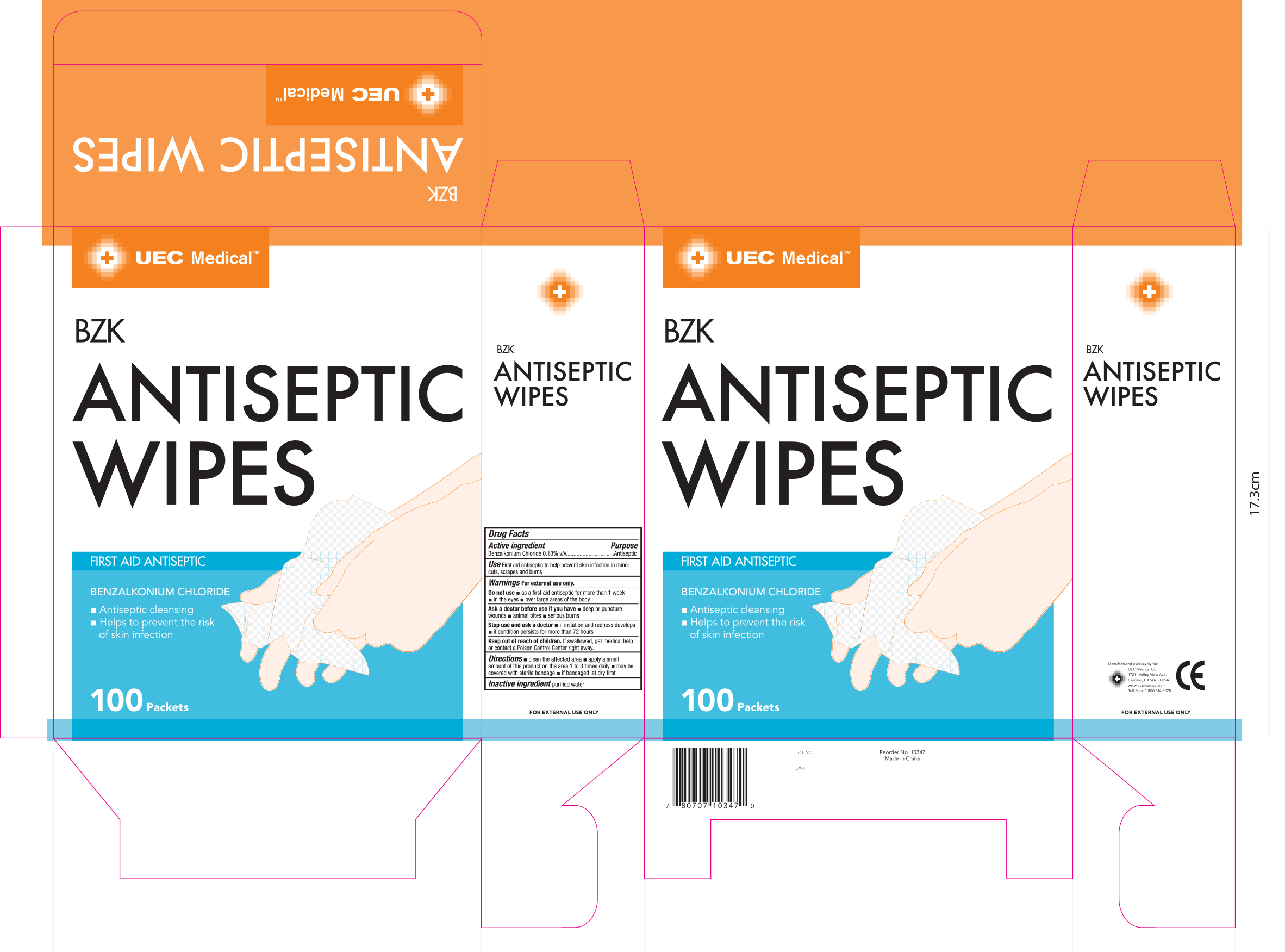 I} UEC MedicalĀ® Antiseptic Wipes are designed for first-aid use as an antiseptic cleaner to prevent skin infection. The active ingredient Benzalonium GHOTde 01990 acts as an antiseptic cleaning agent, while its inactive ingredient, purified water, helps to keep the skin moisturized. Apply a small amount of the product on the affected area 1-3 times a day, cover with a sterile bandage. Not suitable for use on large areas of the body, extensive wounds, deep punctures, animal bites, or serious burns. If skin irritation and redness develop or the condition does not improve for more than 72 hours, stop use and consult a doctor. Keep out of reach of children. This product contains 100 antiseptic wipes and is made in China. For external use only.*