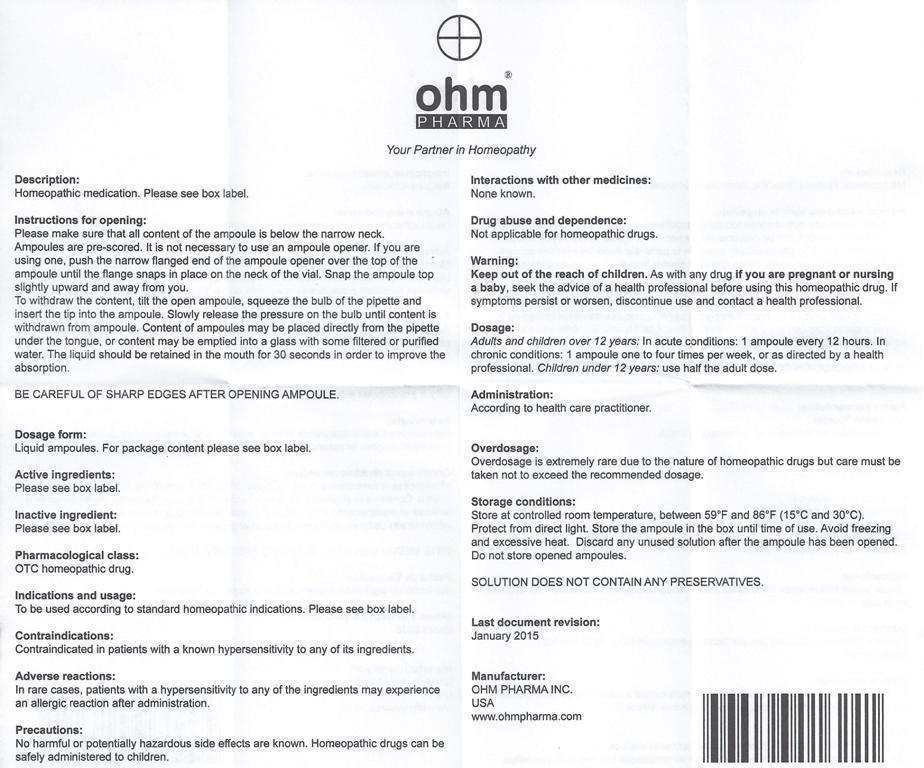 OHM-RESB is a professional use only, pharmaceutical grade, homeopathic medication containing 12 oral ampoules of 2.2 ml each. The active ingredients are Aconitum 6X, Aranea 9X, Bryonia 6X, Equisetum 7, Eupatorium Perf 5X, Hydrastis 7X, Juglans Reg 6X, Kali Bic 12X, Phosphorus 7X, Sarsaparrilla 9X, Sulphur 8X; 0.09 ml each. It is indicated for use after medical prescription. OHM-RESB must be kept protected from moisture, light, and heat, and stored at no more than 30°C. The medication must be kept out of reach of children. The solution does not contain any preservatives, and unused solution should be discarded. To consume, snap off the ampoule top, place under the tongue using a pipette, hold it for 30 seconds, and swallow. Dosage varies for adults, children over 12 years, and children under 12 years. OHM PHARMA COLOMBIA Ltda distributes it in Colombia. The Medicine is manufactured by OHM PHARMA, INC., in Texas, USA.*