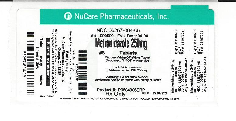 This is a label of Netronidazole 250mg Tablets, with Rx Only indication, manufactured by NuCare Pharmaceuticals. The NDC code is 66267-804-06 and the Lot # is 000000 Exp. Date: 00-00. It is meant for ARV, HEEP T O REACH F CHLOREN and should be stored at a controlled temperature of 8067.*