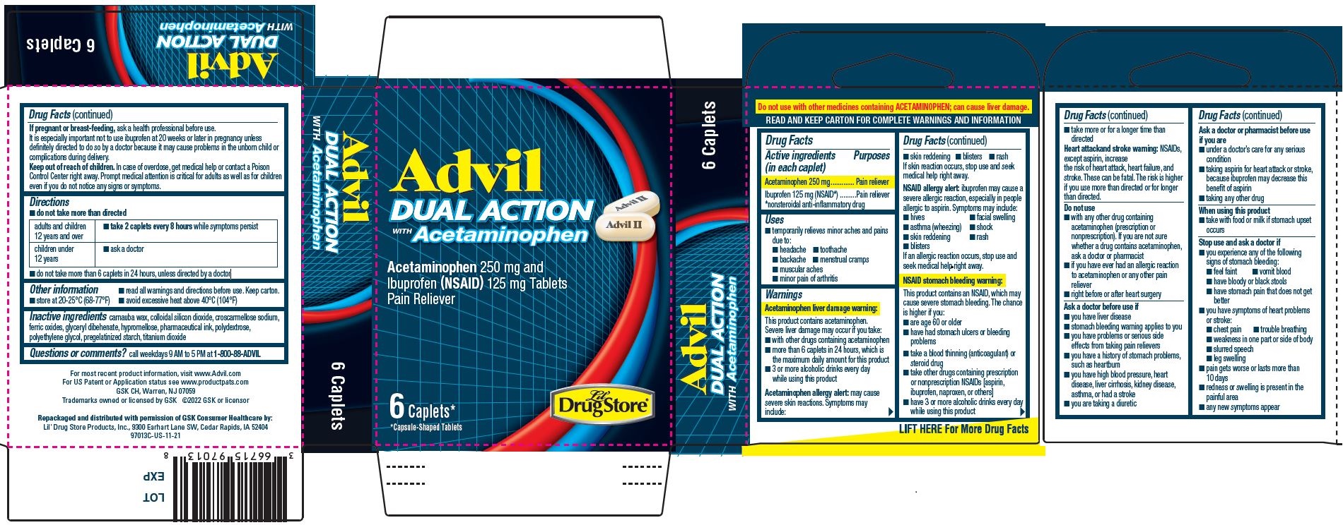 The following image provide visual information about the product associated with Advil Dual Action With Acetaminophen NDC 66715-9601 by Lil' Drug Store Products, Inc., such as packaging, labeling, and the appearance of the drug itself. This resource could be helpful for medical professionals, pharmacists, and patients seeking to verify medication information and ensure they have the correct product.