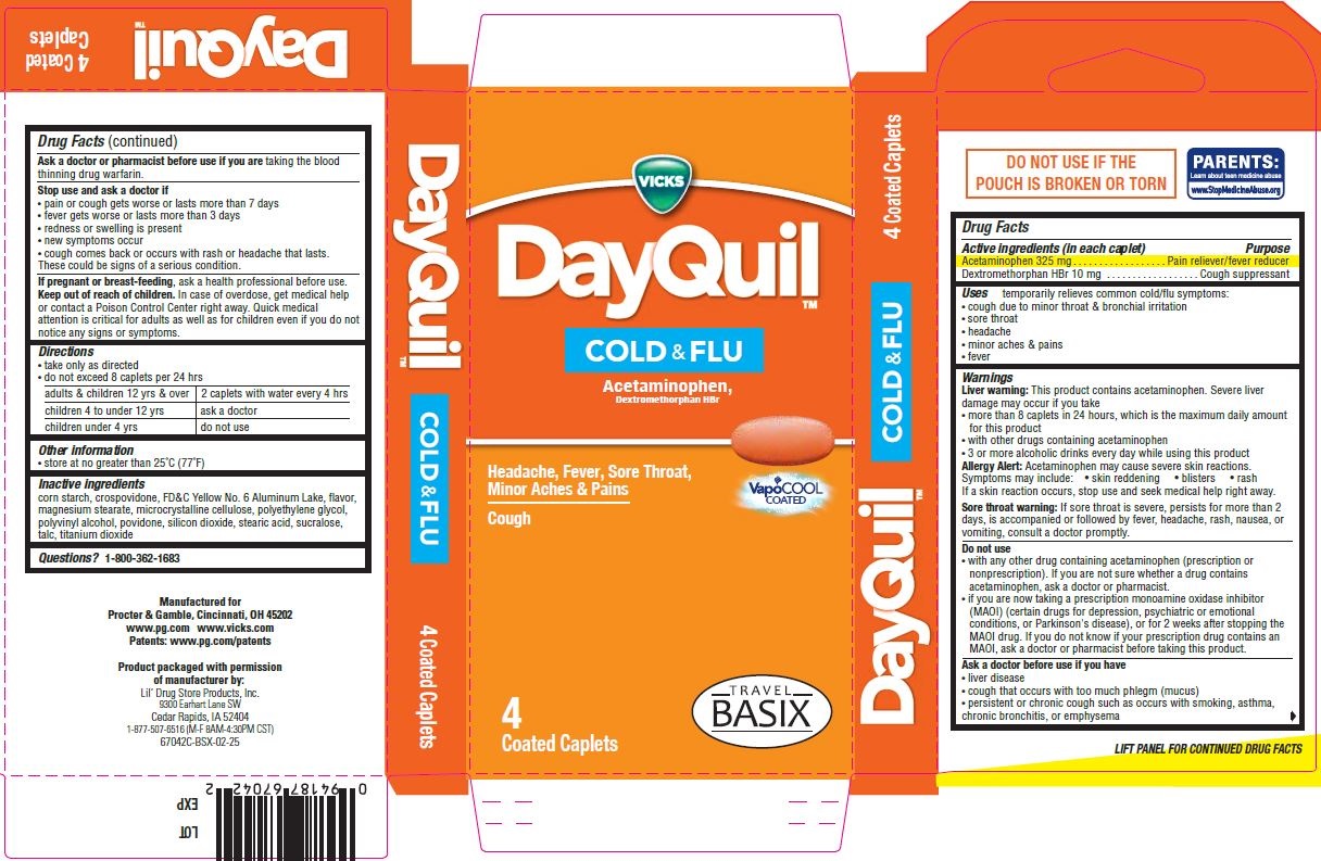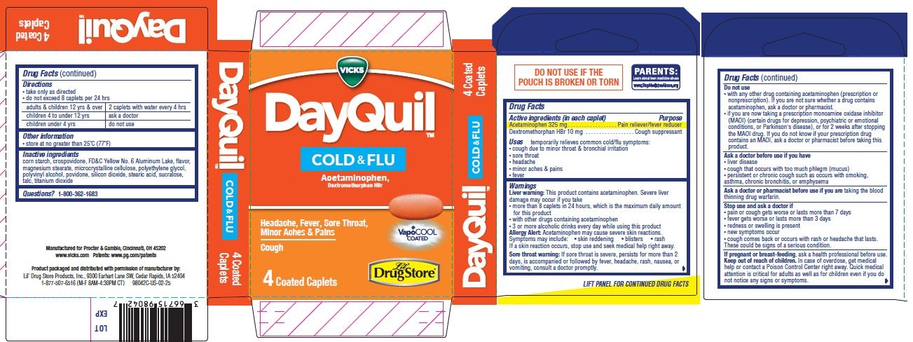 The following 3 images provide visual information about the product associated with Dayquil Cold And Flu W/vapocool, 4ct (pe-free), Lil Drug Store NDC 66715-9604 by Lil' Drug Store Products, Inc., such as packaging, labeling, and the appearance of the drug itself. This resource could be helpful for medical professionals, pharmacists, and patients seeking to verify medication information and ensure they have the correct product.