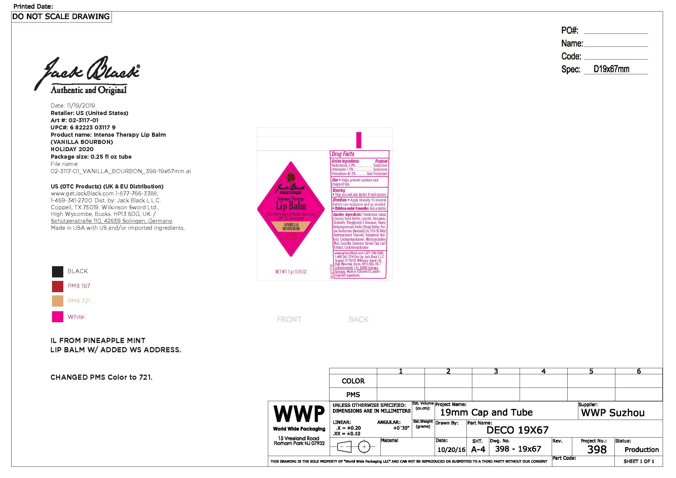 The text describes the product details of Intense Therapy Lip Balm (VANILLA BOURBON) by Jack Black L.L.C. for the Holiday 2020 season. The lip balm comes in a 0.25 fl oz tube and contains sunscreen and skin protectant to prevent sunburn and chapped lips. The package file name is 02-3117-01_VANILLA_BOURBON_388-19x67mm. The lip balm is made in the USA with US and/or imported ingredients. The product is distributed by Jack Black L.L.C. in the US and Wilkinson Sword Ltd. in the UK & EU. The text further includes a drug facts table and directions for use. Finally, the text includes a technical drawing of the packaging of the product.*