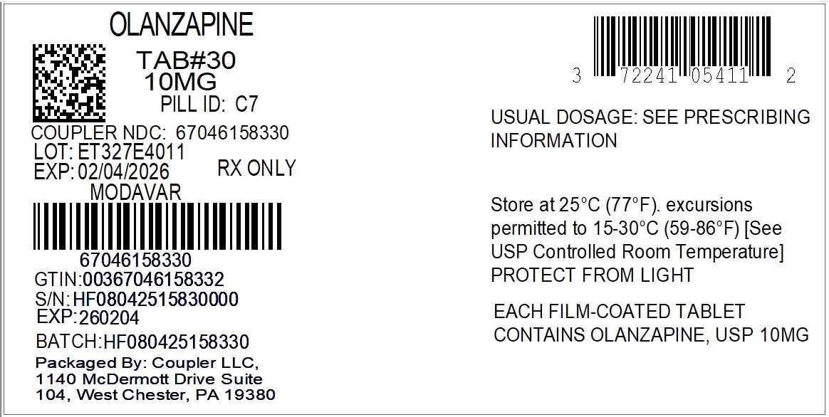This description includes information about Olanzapine tablets in 10mg strength. The tablets are in a package of 30 and are identified by the PillID number C7. The expiration date is 02/04/2026 and the medication is for prescription use only. The medication is Modavar and the pack has a GTIN number of 00367046158332. The batch number is HF080425158330 and it was packaged by Coupler LLC in West Chester, PA. The usual dosage instructions can be found in the prescribing information. It is advised to store the tablets at 25°C (77°F) with excursions permitted between 15-30°C (59-86°F) and protect from light. Each film-coated tablet contains Olanzapine, USP 10mg.*