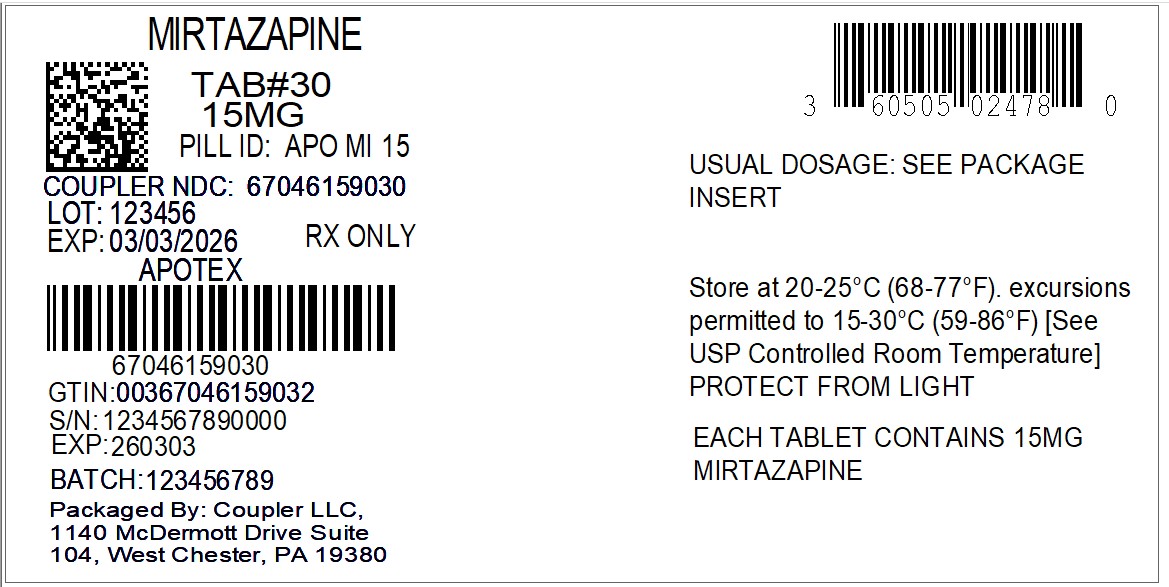 The following image provide visual information about the product associated with Mirtazapine NDC 67046-1590 by Coupler Llc, such as packaging, labeling, and the appearance of the drug itself. This resource could be helpful for medical professionals, pharmacists, and patients seeking to verify medication information and ensure they have the correct product.