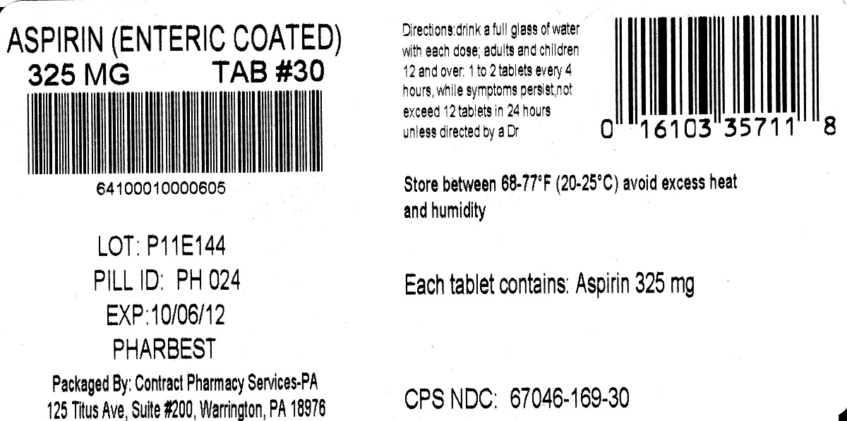 This is a bottle of 30 enteric-coated aspirin tablets with 325mg per tablet. The recommended dosage is 1-2 tablets every four hours for adults and children over 12 years old, but not to exceed 12 tablets in 24 hours unless directed by a doctor. The lot number is P11E144, each tablet contains 325mg of aspirin, and the expiration date is 10/06/12. The tablets should be stored between 68-77°F (20-25°C) and protected from excess heat and humidity. Packaged by Contract Pharmacy Services-PA, the NDC code is 67046-169-30.*