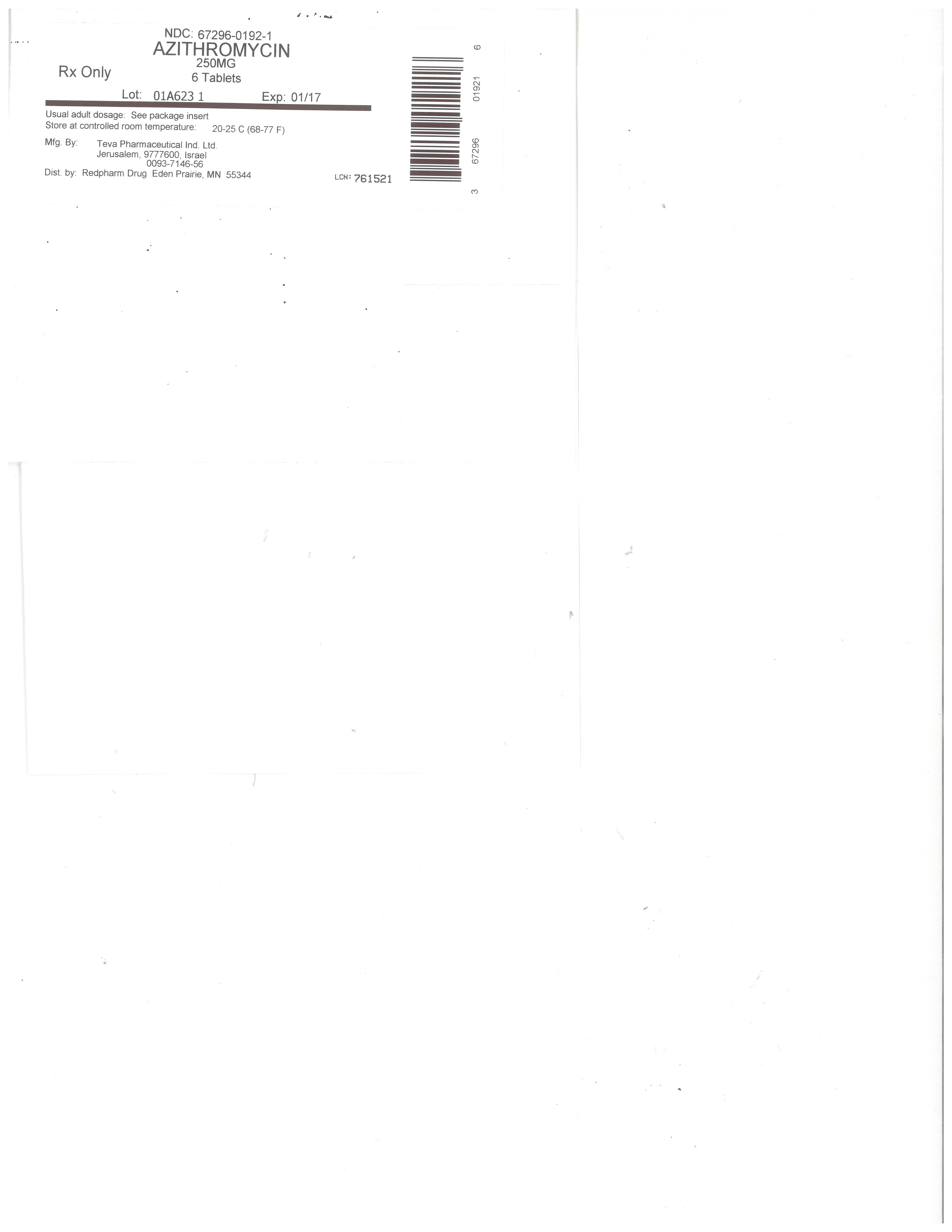 This is a description of a medication with NDC code 67296-0192-1, containing Azithromycin 250mg, available only with a prescription and packaged with 6 tablets. The lot number is 01A623 1 with expiration date 01/17. The recommended adult dosage is mentioned in the package insert, and the medication should be stored at 20-25C (68-77 F). The medication is manufactured by Teva Pharmaceutical Industries Ltd. in Jerusalem, Israel, and distributed by Redpharm Drug in Eden Prairie, MN.*