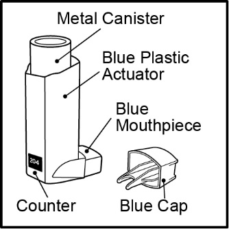 - The blue plastic actuator sprays the medicine from the metal canister. The plastic actuator has a blue protective cap that covers the mouthpiece. See Figure A.Keep the protective cap on the mouthpiece when the metal canister is not in use.