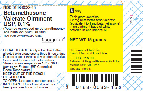 This text provides information on a medication with NDC 0168-0033-15, which is Betamethasone Valerate Ointment USP 0.1% equivalent to 1 mg betamethasone. It is intended for dermatologic use only and should not be used in the eyes. The usual dosage involves applying a thin layer to affected skin areas one to three times a day. The product comes in a 15-gram package. Proper storage instructions and a caution to keep it out of reach of children are provided. Additional details can be found in the insert included with the product.*