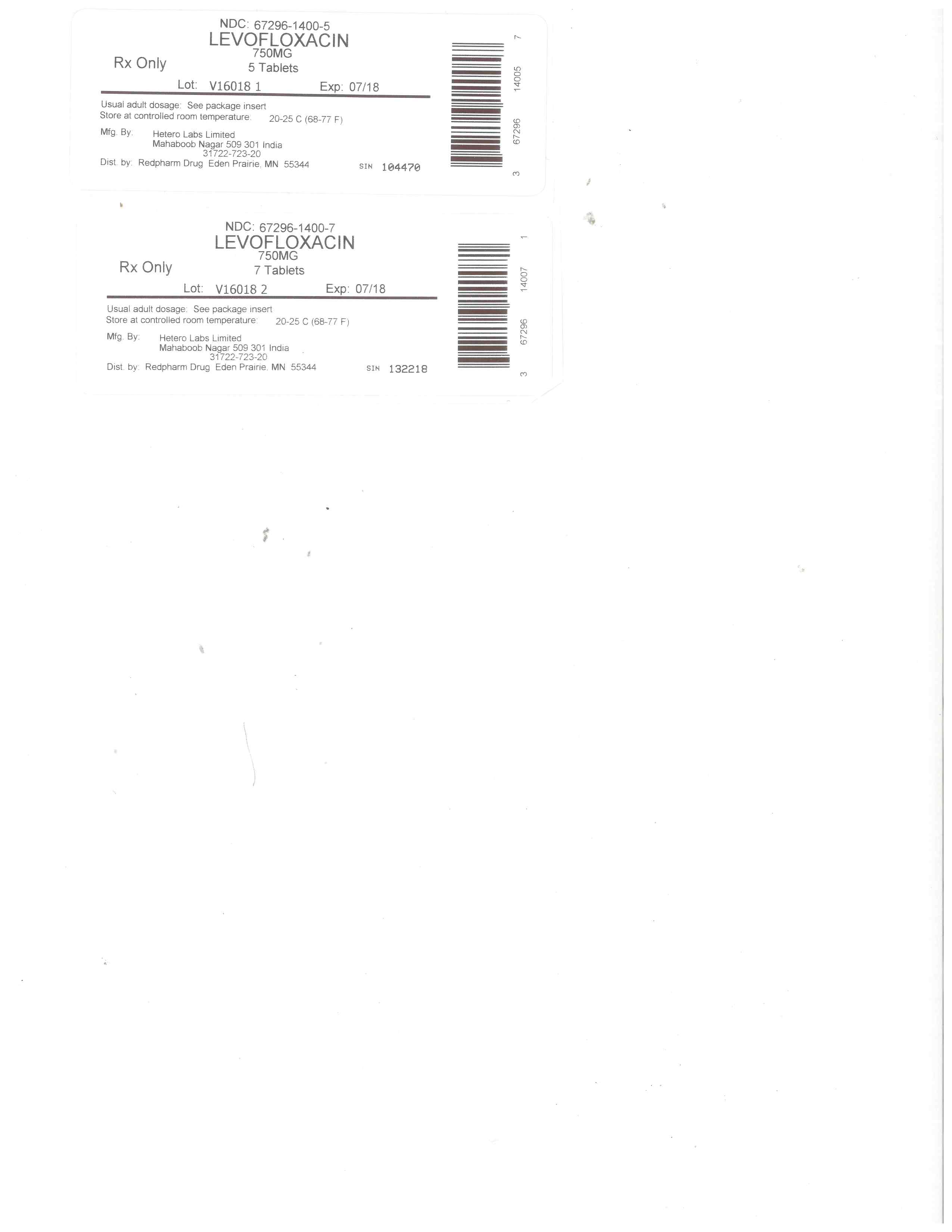 This text describes two different packages of Levofloxacin, an antibiotic medication that requires a prescription. The first package contains 5 tablets of 750mg each with the Lot number V16018 1 and an expiration date of July 2018. The second package contains 7 tablets of 750mg each with the Lot number V16018 2 and an expiration date of July 2018 as well. Both packages provide the manufacturer's address in India and the distributor's address in Minnesota. The text also indicates the usual adult dosage and storage conditions for the medication.*