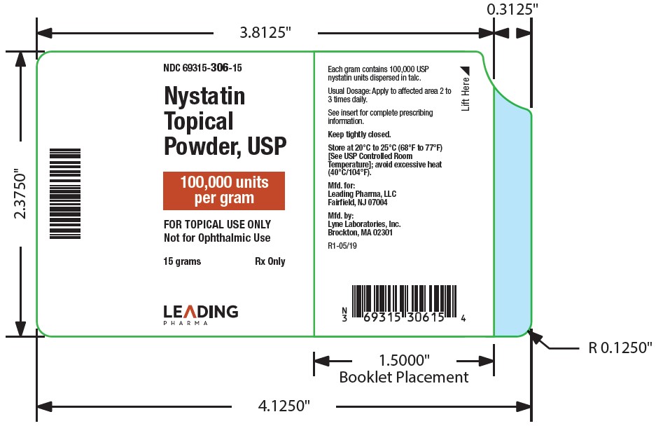 This is a product label for a medication containing Nystatin, which is typically used to treat fungal infections. The label provides information on the dosage, storage instructions, manufacturer details, and warnings against ophthalmic use. It is in powder form and meant for topical application. The dosage instructions recommend applying to the affected area 2-3 times daily. The label also includes the NDC code (69315-306-60) and the quantity of the medication (60 grams).*