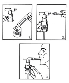 - Sit in a comfortable, upright position; place the mouthpiece in your mouth (Figure 3)(or put on the face mask); and turn on the compressor.