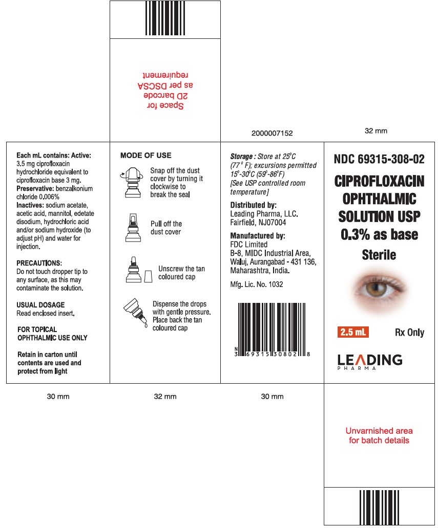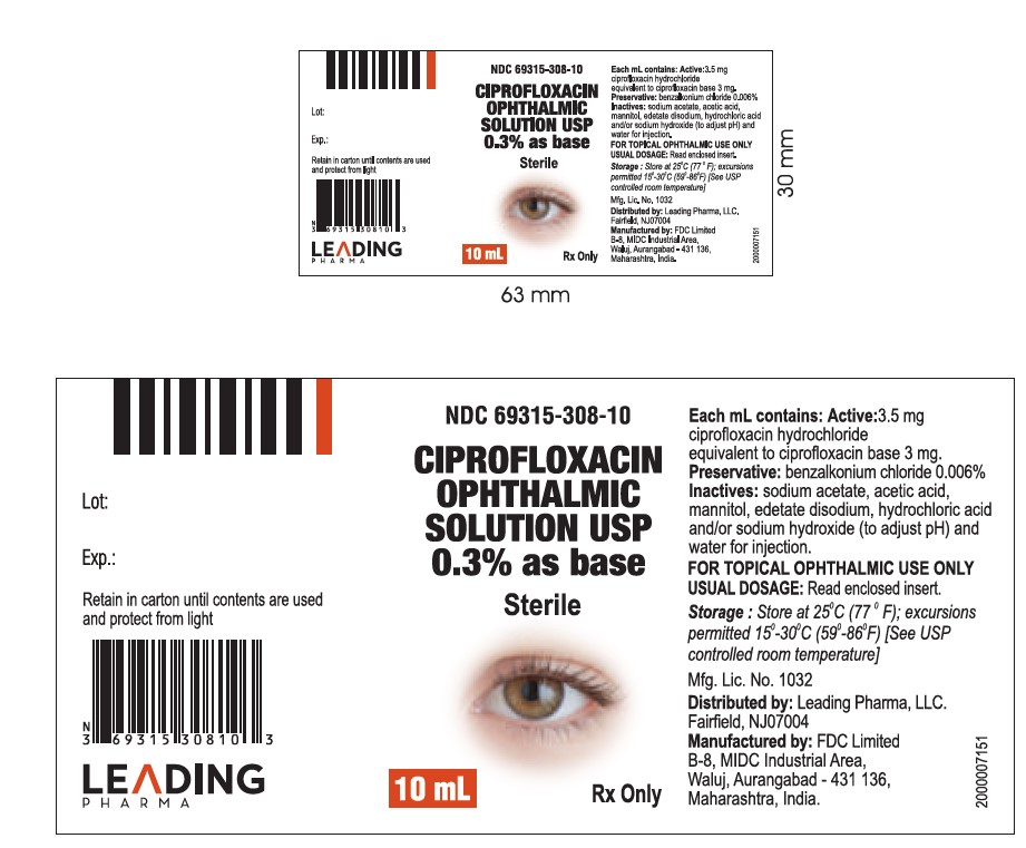 This text provides details about Ciprofloxacin Ophthalmic Solution USP 0.3% as base. It includes information on the active ingredients, storage instructions, manufacturer details, and more. This product is indicated for topical ophthalmic use only. The solution contains ciprofloxacin hydrochloride equivalent to ciprofloxacin base 3 mg, as well as benzalkonium chloride as a preservative. For more accurate dosage information, it suggests referring to the enclosed insert. The manufacturer is FDC Limited, located in Maharashtra, India, and the product is distributed by Leading Pharma, LLC, located in Fairfield, NJ.*