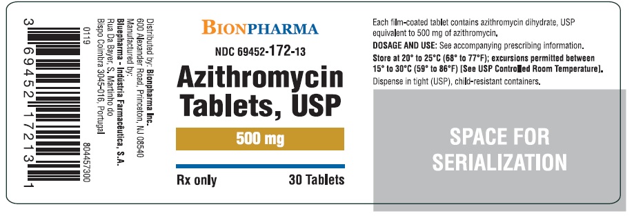 This is a description of Azithromycin Tablets, USP, a type of medication. Each film-coated tablet contains azithromycin dihydrate, USP, equivalent to 250 mg of zithromycin. It is indicated for prescription use only, with a quantity of 30 tablets per pack. The recommended dosage and usage instructions are mentioned in the accompanying prescribing information. Storage conditions are specified as between 20°C to 25°C (68°F to 77°F), with limited excursions permitted between 15°C to 30°C (59°F to 86°F). Dispensing should be in tight, child-resistant containers. The National Drug Code (NDC) for this product is 69452-171-13.*