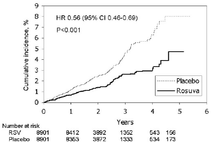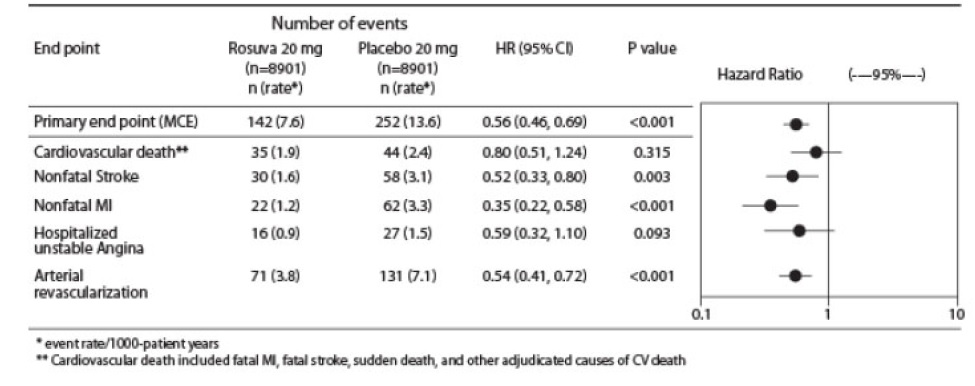This text provides data on the number of events in a clinical trial comparing the effects of Roswva20mg and Placebo2omg on various cardiovascular outcomes. It includes information on the hazard ratios for the primary endpoint (MCE), cardiovascular death, nonfatal stroke, nonfatal MI, hospitalized unstable angina, and arterial revascularization. The results show significant differences in event rates between the treatment groups, with associated confidence intervals and p-values. Additionally, the text defines cardiovascular death and specifies the included causes.*