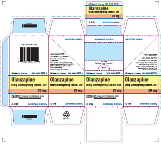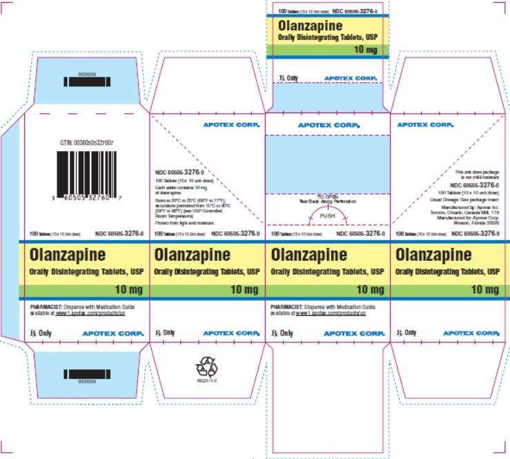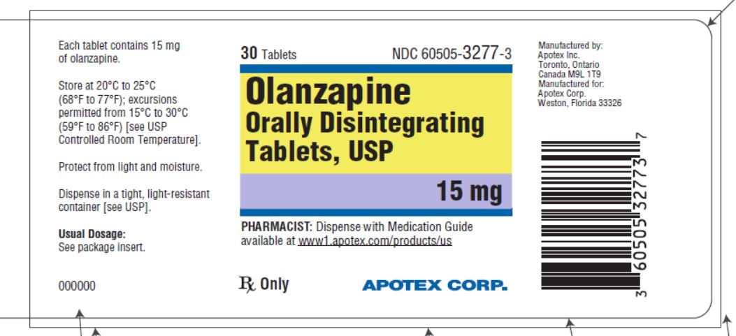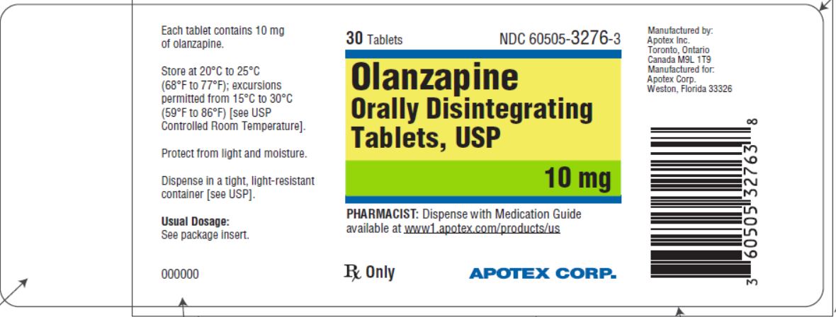 Each tablet contains 5 mg of Olanzapine. The tablets should be stored at a temperature between 20°C to 25°C (68°F to 77°F) with excursions allowed from 15°C to 30°C (69°F to 86°F). It is important to protect them from light and moisture. This package contains 30 tablets of Olanzapine Orally Disintegrating Tablets, USP. The product should be dispensed in a tight, light-resistant container. The NDC number is 60505-3275-3. The manufacturer is Apotex Corp. Pharmacist should dispense with a Medication Guide. Additional dosage information is available in the package insert.*