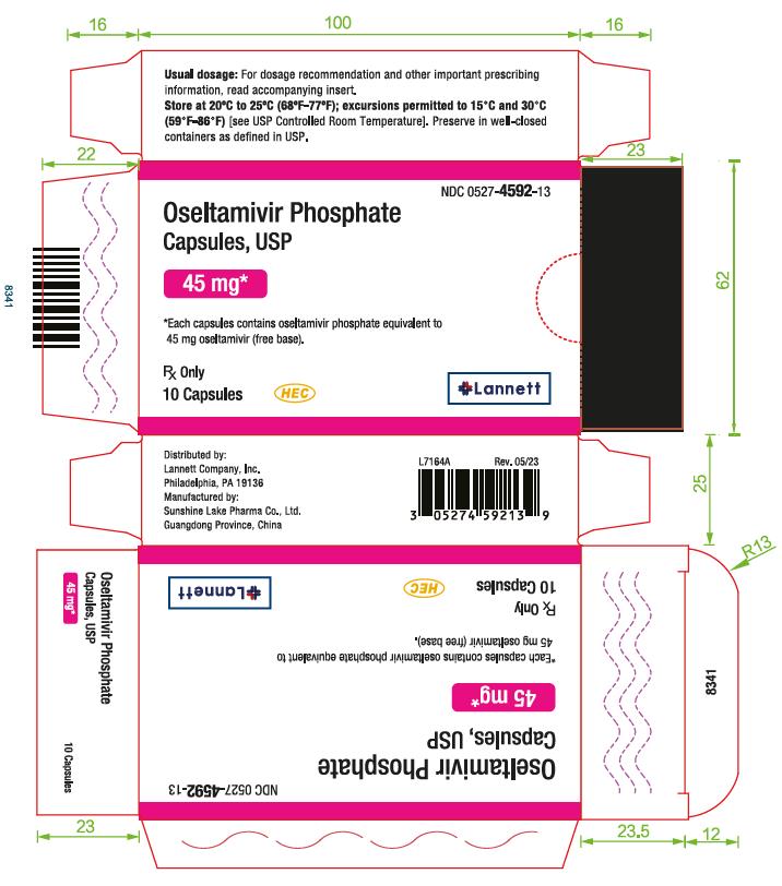 What are the ingredients in oseltamivir phosphate capsules? Active ingredient:oseltamivir phosphate Inactive ingredients: Oseltamivir phosphate capsules:croscarmellose sodium, povidone K29/32, pregelatinized starch, sodium stearyl fumarate, and talc 30mg capsule shell:black iron oxide, gelatin, potassium hydroxide and titanium dioxide 45mg capsules shell:FD&C Blue#1 Aluminum Lake, gelatin, iron oxide yellow, and titanium dioxide 75mg capsules shell:black iron oxide, Brilliant blue FCF – FD&C Blue 1, gelatin, potassium hydroxide, quinoline yellow and titanium dioxide Trademarks are the property of their respective owners. Manufactured by: Sunshine Lake Pharma Co., Ltd., No. 1, Northern Industry Road, Northern Industry Park of Song Shan Lake, Dongguan 523808, Guangdong, China Manufactured for: Lannett Company, Inc. Philadelphia, PA 19136 | |