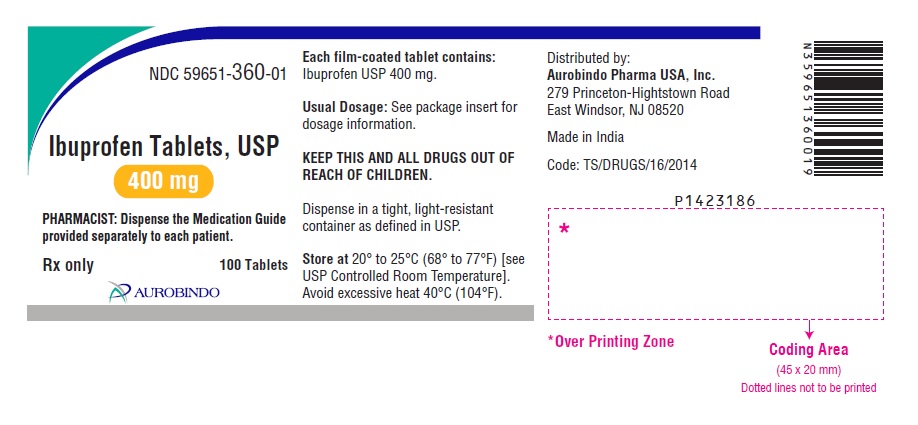 This is a description for Ibuprofen Tablets, USP with NDC 59651-362-01. Each film-coated tablet contains Ibuprofen USP 800 mg. The usual dosage information can be found in the package insert. It is recommended to keep this medication and all drugs out of reach of children. Store in a tight, light-resistant container at 20° to 25°C (68° to 77°F) and avoid excessive heat above 40°C (104°F). This medication is distributed by Aurobindo Pharma USA, Inc., with manufacturing in India. The code for this product is TS/DRUGS/16/2014.*