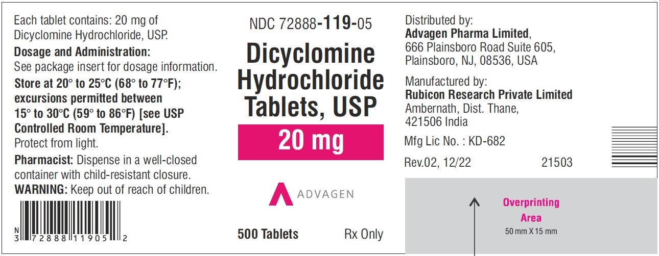 Dicyclomine Hydrochloride Tablets ,USP 20 mg - NDC 72888-119-05 - 500 Tablets Label - dicyclomine hcl tablets usp 20mg 500s