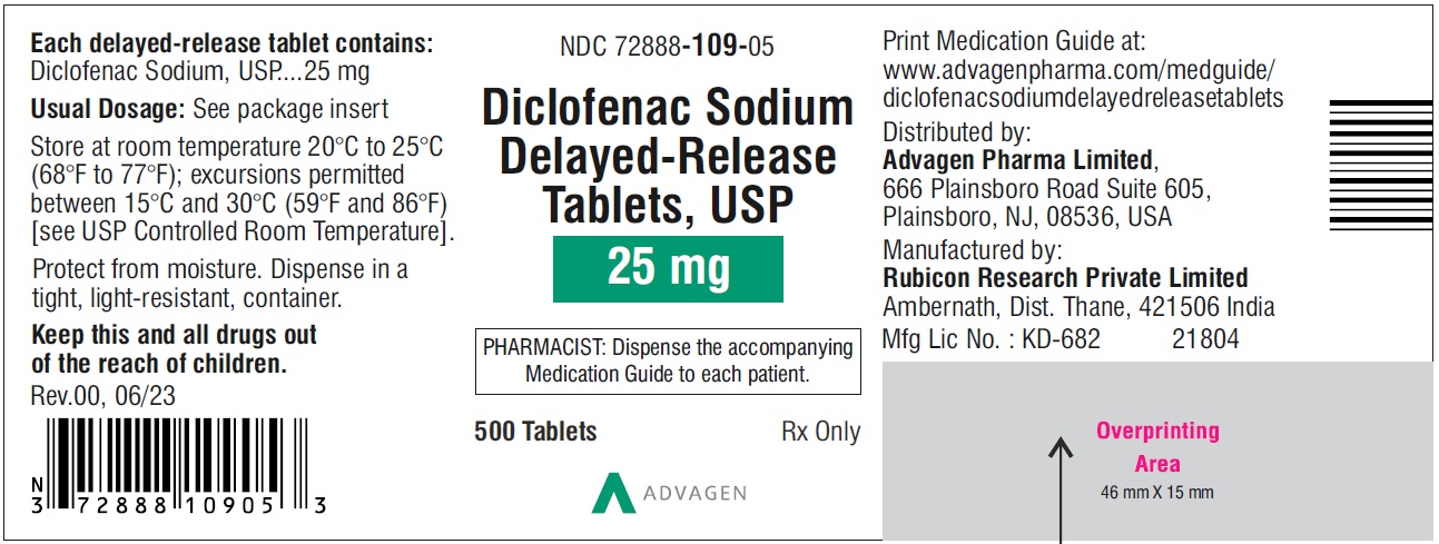 Diclofenac Sodium DR Tablets 25mg - NDC 72888-109-05 - 500 Tablets Label - diclofenac sodium dr tablets usp 25mg 500s