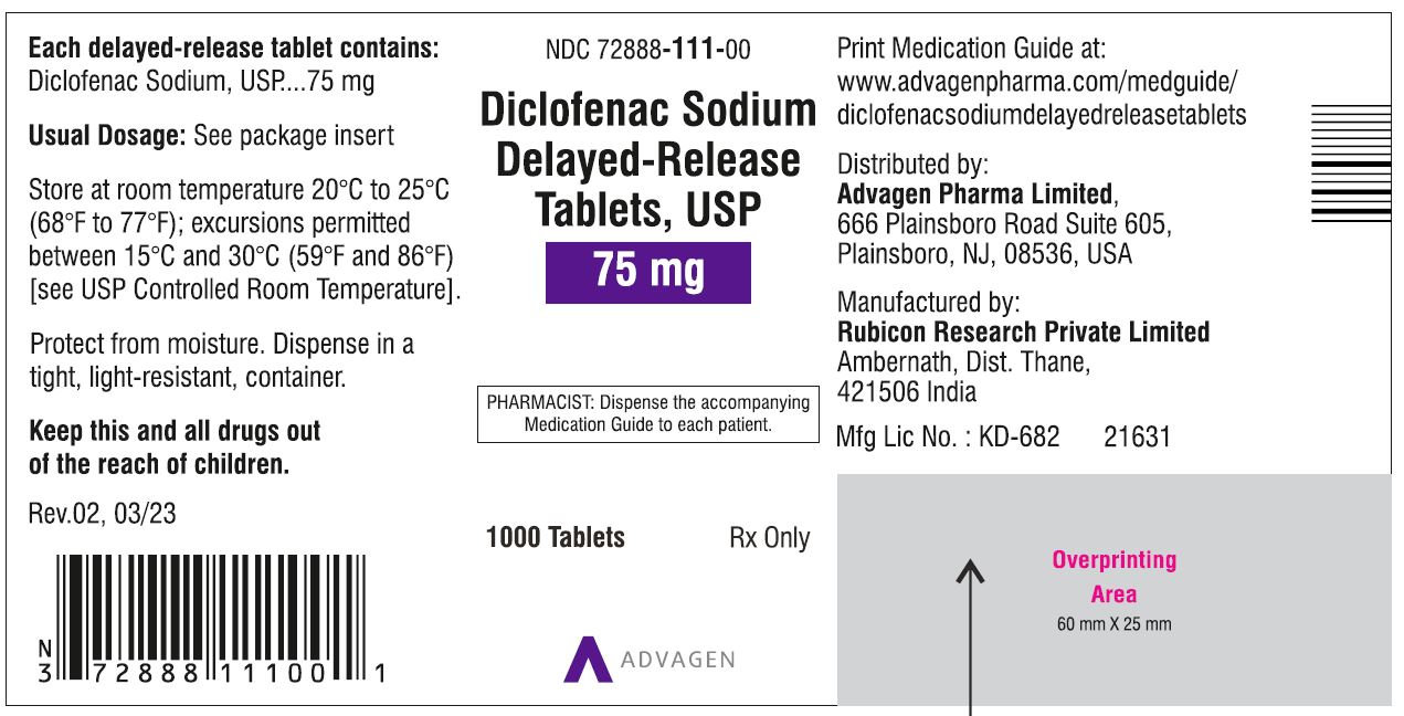 Diclofenac Sodium DR Tablets 75mg - NDC 72888-111-00 - 1000 Tablets Label - diclofenac sodium dr tablets usp 75mg 1000s