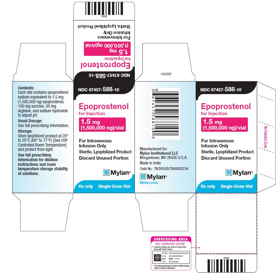 10 mL vial with a light blue flip-off seal containing epoprostenol sodium equivalent to 1.5 mg (1,500,000 ng) epoprostenol, is packaged in carton of 1 vial (NDC 67457-588-10).