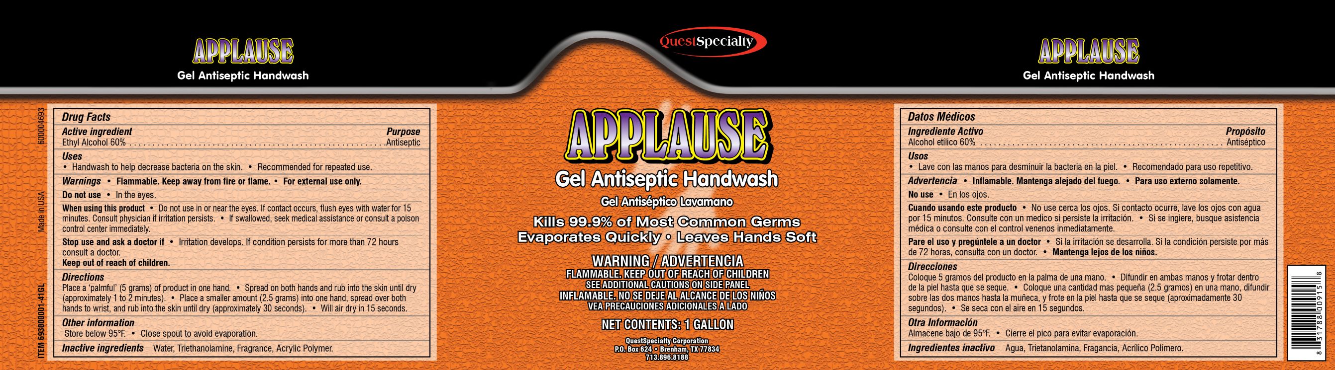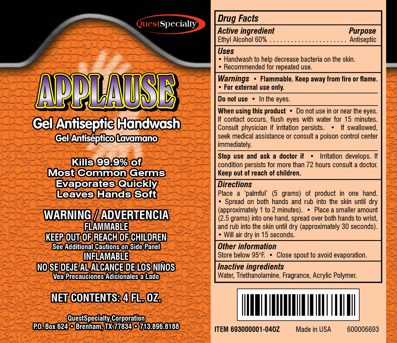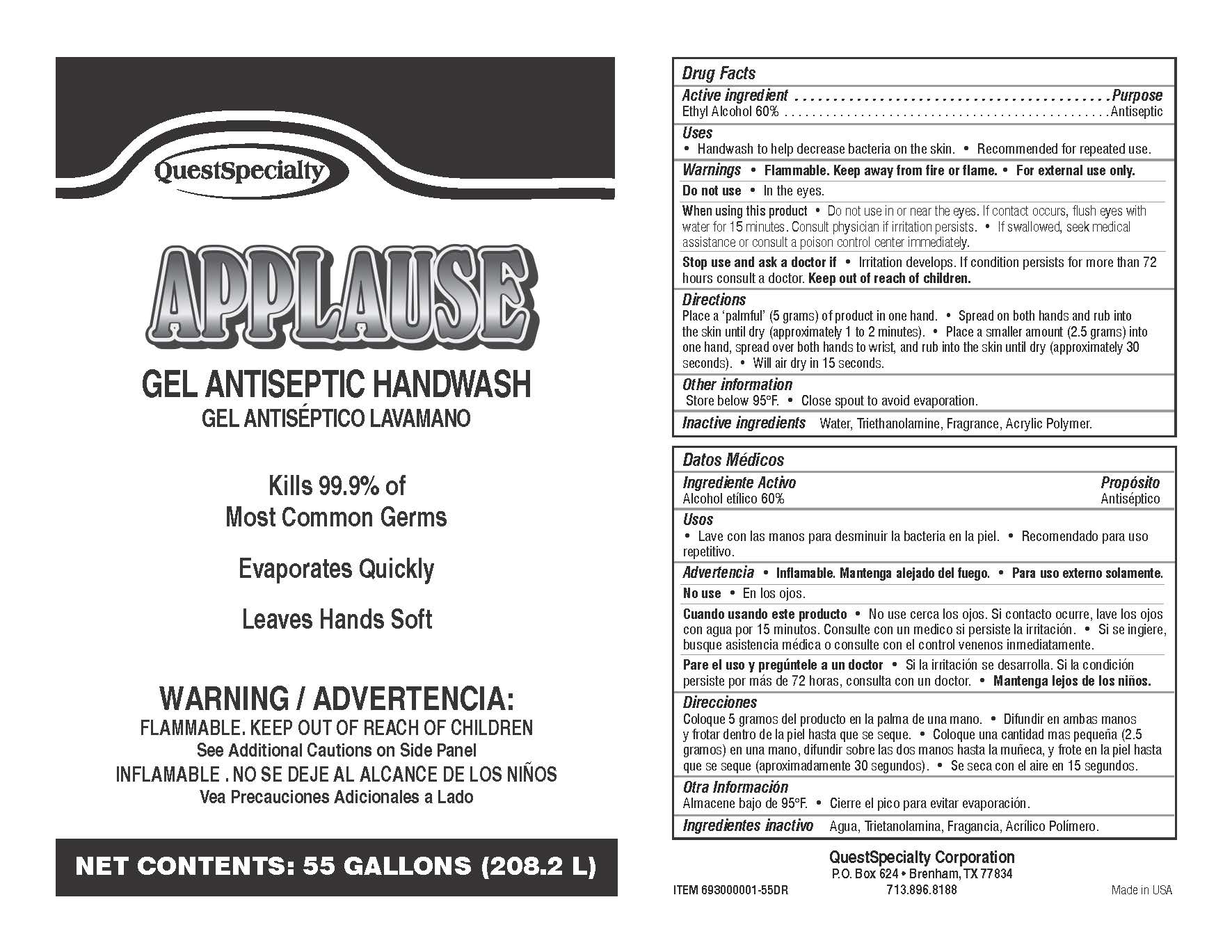 This is a description of a hand sanitizer called Gel Antiseptic Handwash by QuestSpecialty Corporation. It contains 60% ethyl alcohol and is recommended for repeated use to decrease bacteria on the skin. It evaporates quickly and leaves hands soft. It comes in a 55-gallon bottle and has directions for use printed on the label. It is flammable and should be kept out of reach of children. Inactive ingredients include water, triethanolamine, fragrance, and acrylic polymer.*