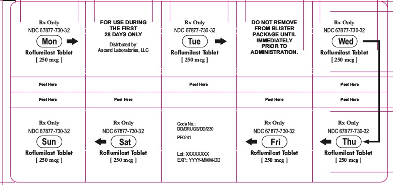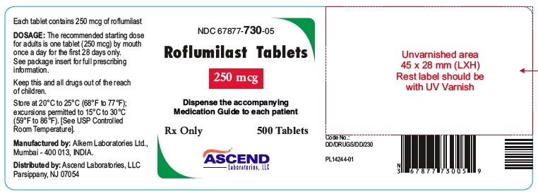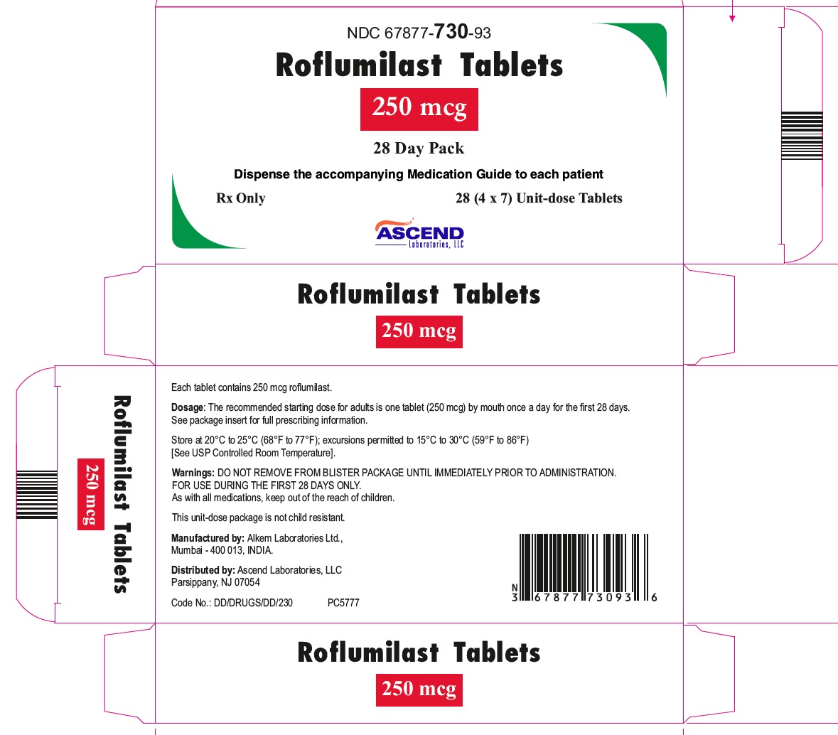 NDC 67877-730-93 Roflumilast Tablets 28 Day Pack. Each tablet contains 250 mcg roflumilast. The recommended starting dose for adults is one tablet (250 mcg) by mouth once a day for the first 28 days. Store at 20°C to 25°C (68°F to 77°F); excursions permitted from 15°C to 30°C (59°F to 86°F). Warning: Do not remove from blister package until immediately prior to administration. Manufactured by: Alkem Laboratories Ltd., Mumbai - 400 013, INDIA. Distributed by: Ascend Laboratories, LLC, Parsippany, NJ 07054.*