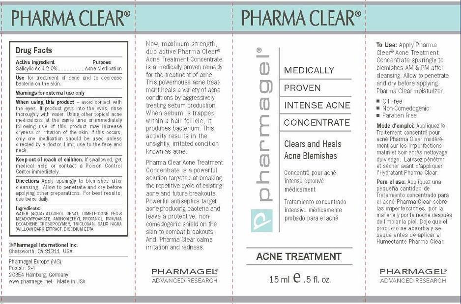 This is a drug information sheet for "Pharma Clear" acne treatment concentrate. It includes ingredients, directions for use, warnings against combining with other acne products, and cautions against use near eyes or ingestion. The concentrate is described as a "medically proven remedy" that is aimed at the treatment of acne. The instructions recommend cleansing and drying the face before applying and waiting for penetration before applying a moisturizer.*