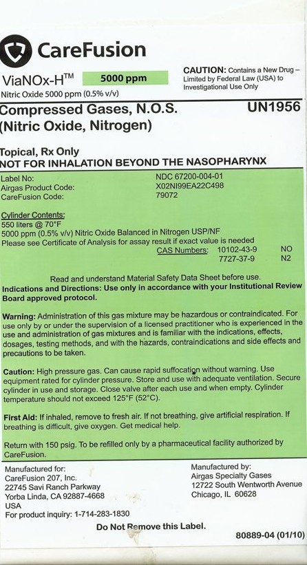 Cautionary details and important instructions for the safe use of ViaNOx-H™ 5000 ppm, a compressed gas containing Nitric Oxide, Nitrogen. The product is only for topical use as it contains a new drug, and not for inhalation beyond the nasopharynx. Carefully read and understand the Material Safety Data Sheet before use, and use only in accordance with your Institutional Review Board approved protocol. The gas mixture must be administered by or under the supervision of a licensed practitioner experienced with gas mixtures, familiar with the indications, effects, dosages, testing methods, and the hazards, contraindications, side effects, and precautions. The cylinder containing the gas mixture is high pressure and can cause rapid suffocation without warning, thus special equipment rated for cylinder pressure should be used. The cylinder should be stored and used with adequate ventilation, and secured in use and storage. The cylinder temperature should not exceed 125°F (62'C). In case of emergency, remove the affected person to fresh air, perform chest resuscitation or provide artificial respiration, and, if necessary, seek medical help. To be refilled, the cylinder should be returned with 150 psig to only pharmaceutical facilities authorized by CareFusion. The product is manufactured by CareFusion 207, Inc., and the label contains all the relevant product codes, cylinder size, etc.*