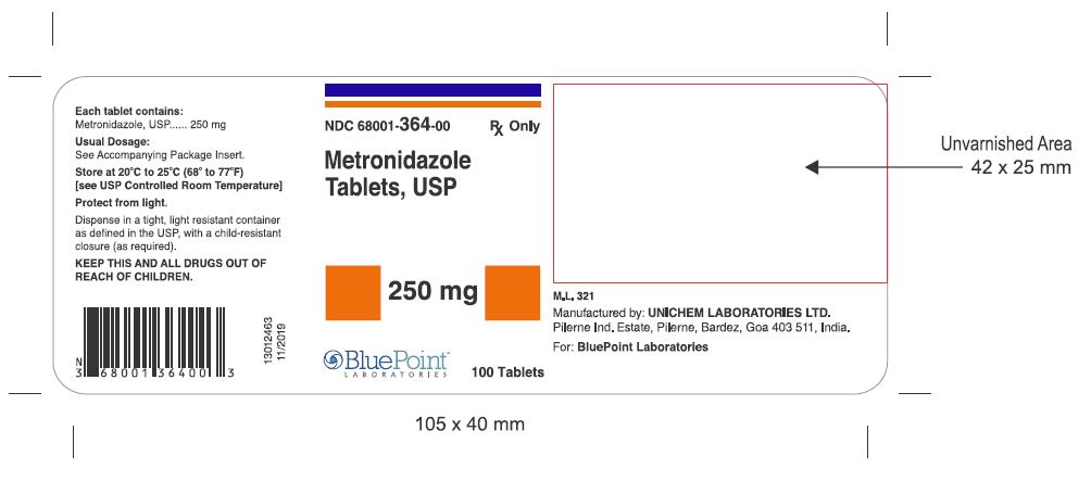 Metronidazole Tablets, USP with a strength of 250mg. The usual dosage information is not available. The tablets are stored between 20°C to 25°C temperature and need to be protected from light. It is advised to keep the medicine away from children's reach. The product comes in an airtight container with 25 tablets. The name of the manufacturer is BUEPRINT Laboratories. NDC code for the product is 68001-364-00.*