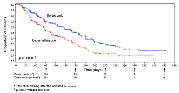 This text seems to be showing the results of a study involving the use of Bortezomib and Dexamethasone in patients. It includes some numeric values and a p-value from a log-rank test. However, without additional context, it is difficult to determine the purpose of the study or the significance of the results.*