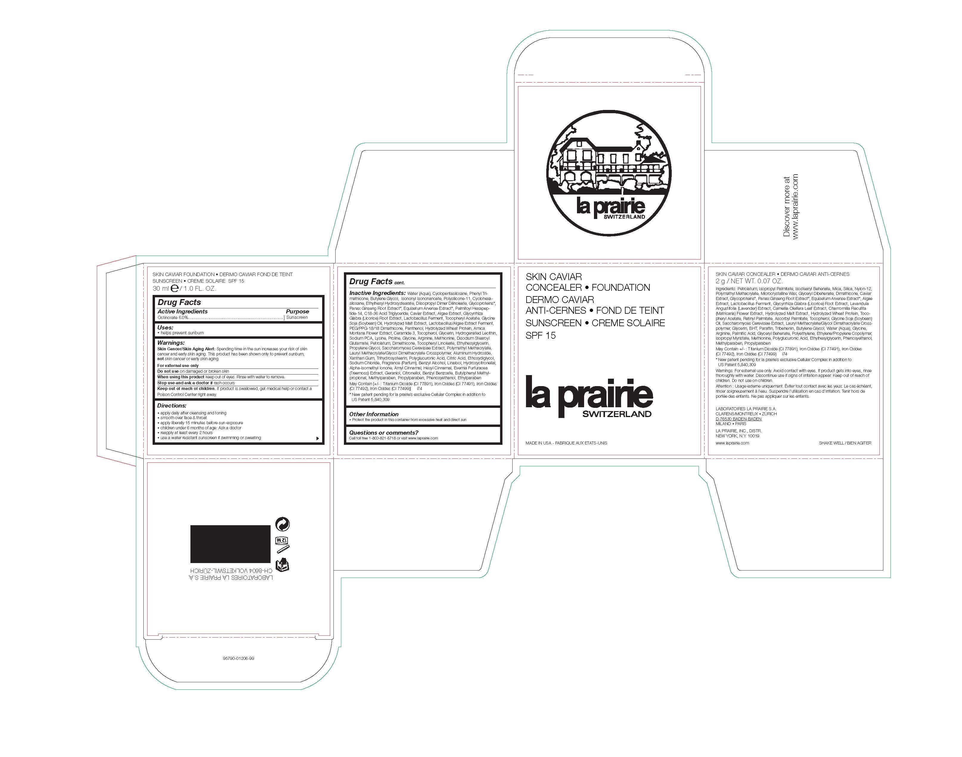 This is a product description for a line of skin care cosmetics from La Prairie, a luxury Swiss brand. The description includes a list of ingredients for the Skin Caviar Concealer, the Skin Caviar Foundation, and the Sunscreen Creme Solaire, with directions for use and warnings. The text also provides contact information for La Prairie and the manufacturers of the products.*