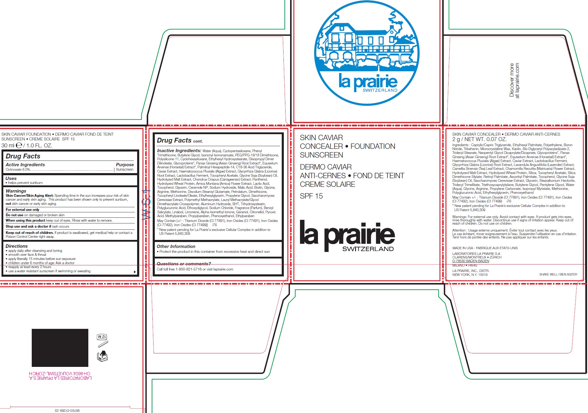 La Prairie is a Switzerland-based company that produces a variety of cosmetic products. Among them are Skin Caviar Foundation, Dermo Caviar Fond de Teint, Sunscreen, and Creme Solare SPF 15. The company warns consumers that spending time in the sun increases the risk of skin cancer and early skin aging. However, their sunscreen product has been shown only to prevent sunburn and not skin cancer or early skin aging. La Prairie also produces a Skin Caviar Concealer and Dermo Caviar Anti-Cernes. Inactive ingredients, directions, and other information are also provided. The text also includes contact information and locations for La Prairie, Inc.*