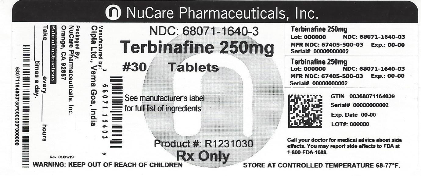 The following 2 images provide visual information about the product associated with Terbinafine Hydrochloride NDC 68071-1640 by Nucare Pharmaceuticals,inc., such as packaging, labeling, and the appearance of the drug itself. This resource could be helpful for medical professionals, pharmacists, and patients seeking to verify medication information and ensure they have the correct product.